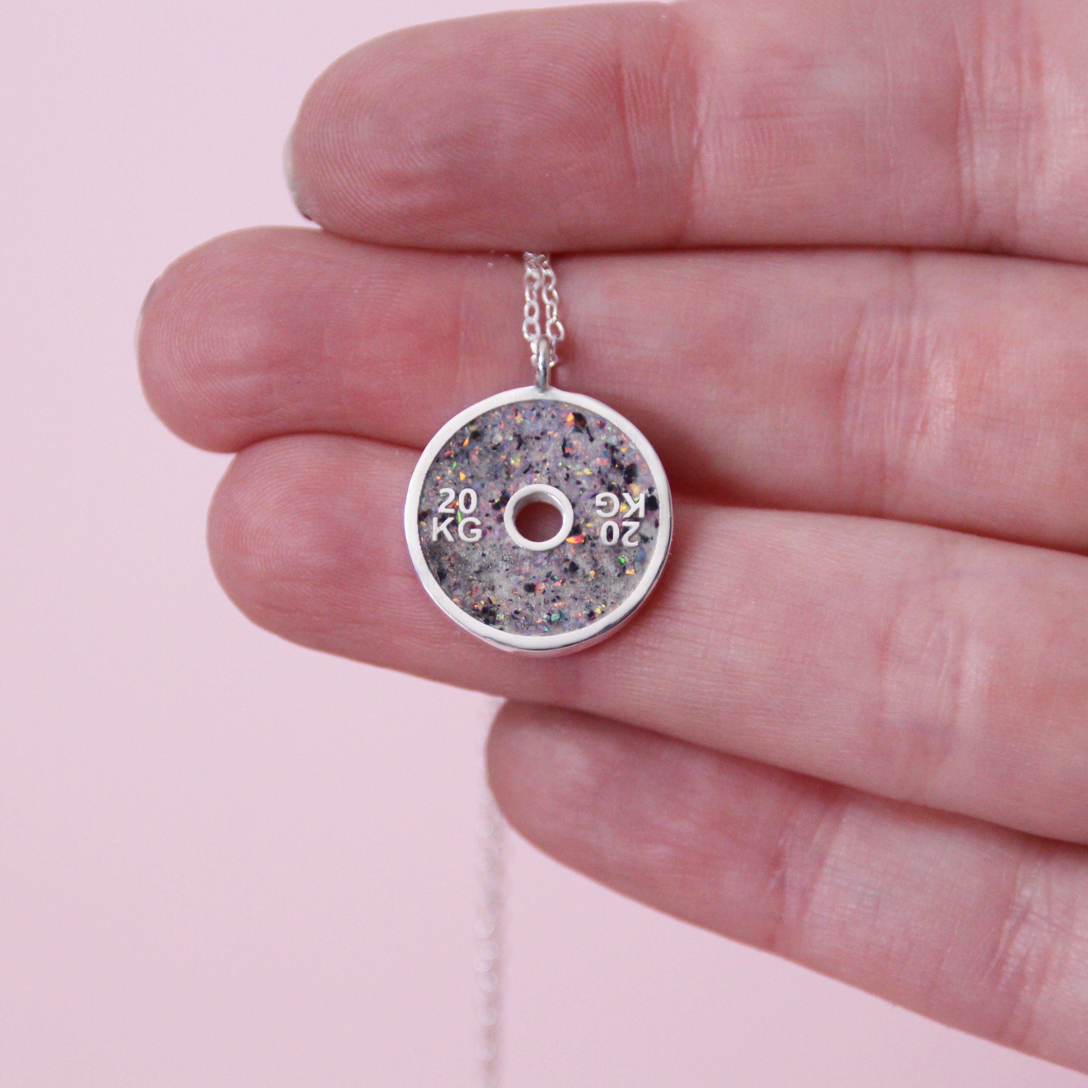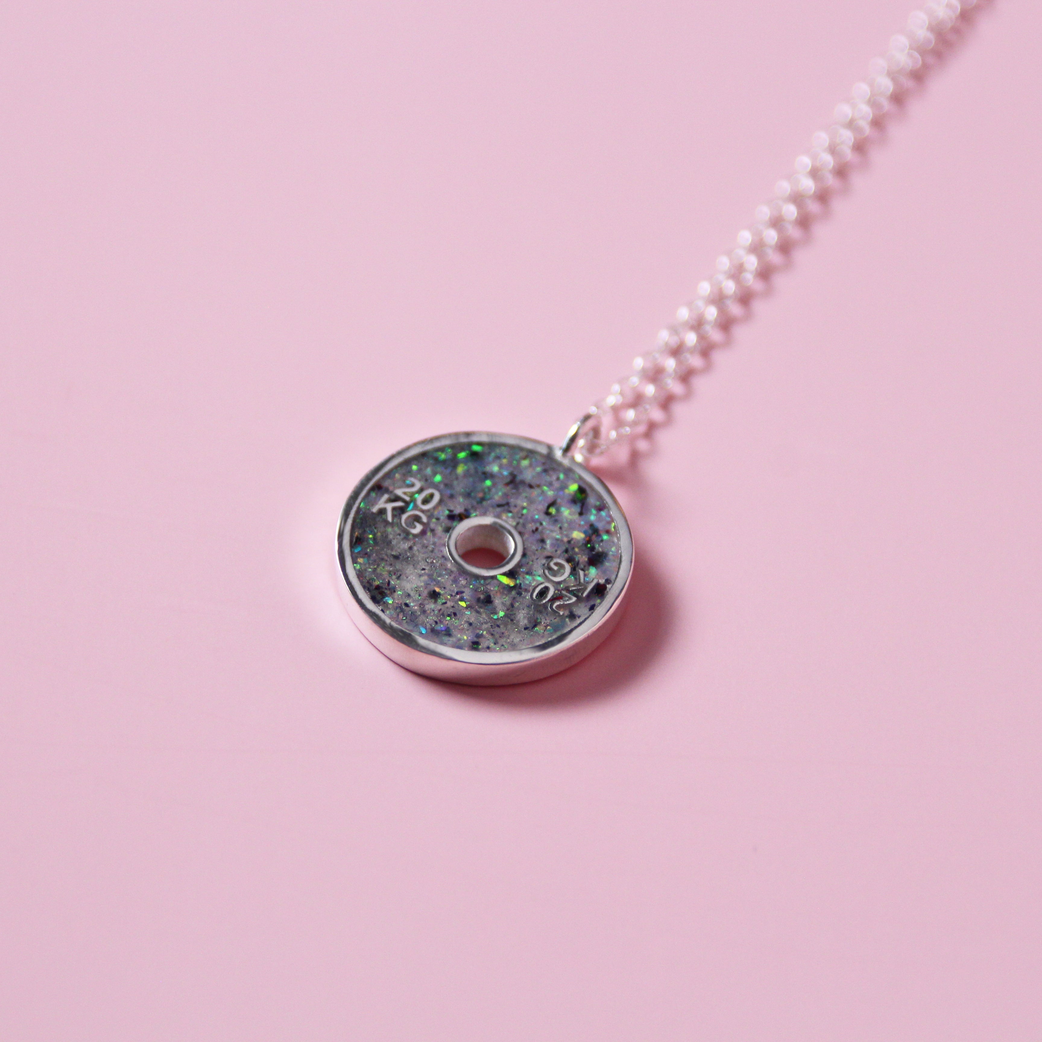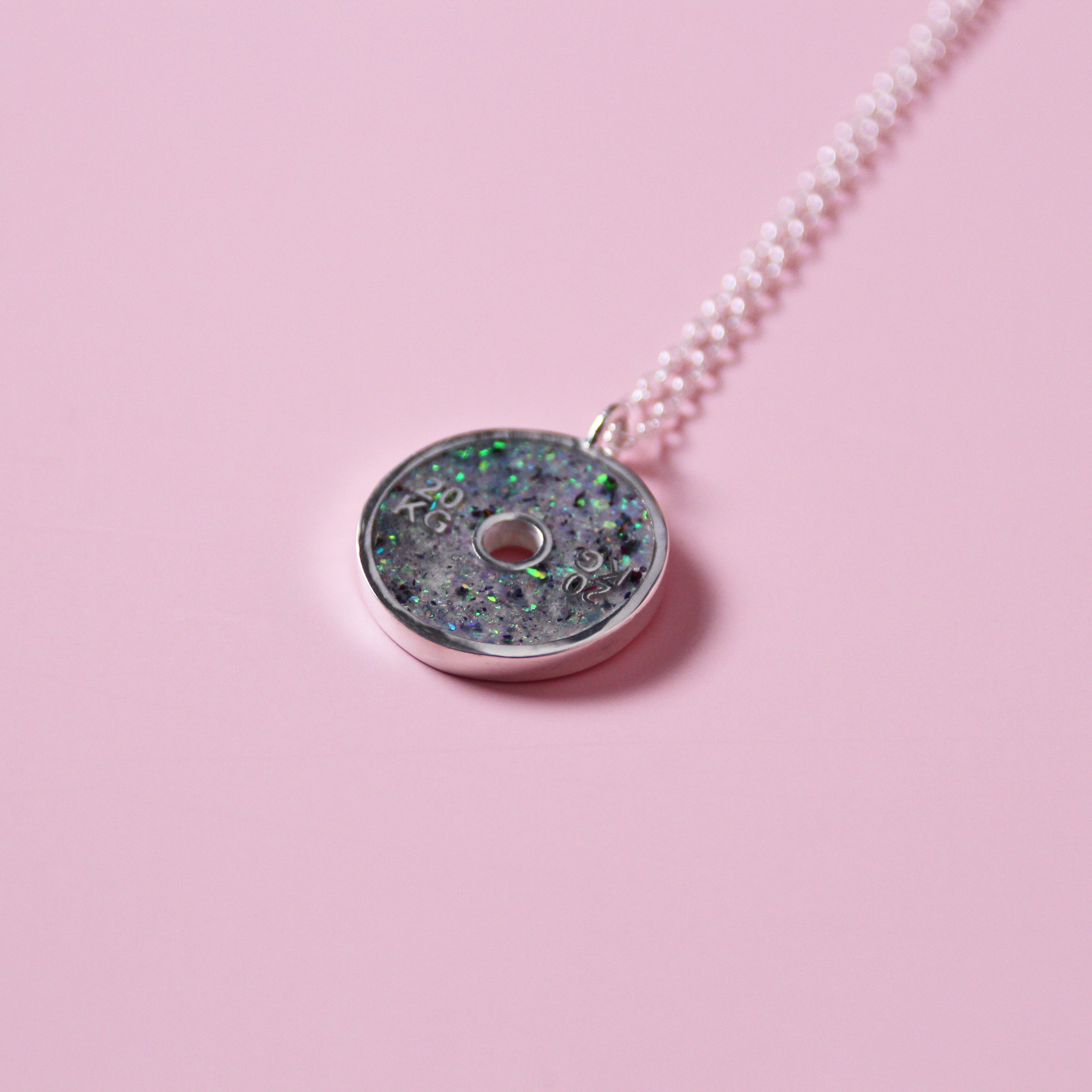 Show off your passion for fitness with our Gym Bumper Plate Necklace. This one-of-a-kind sterling silver piece is inlayed with lab opal and polished to a high shine.