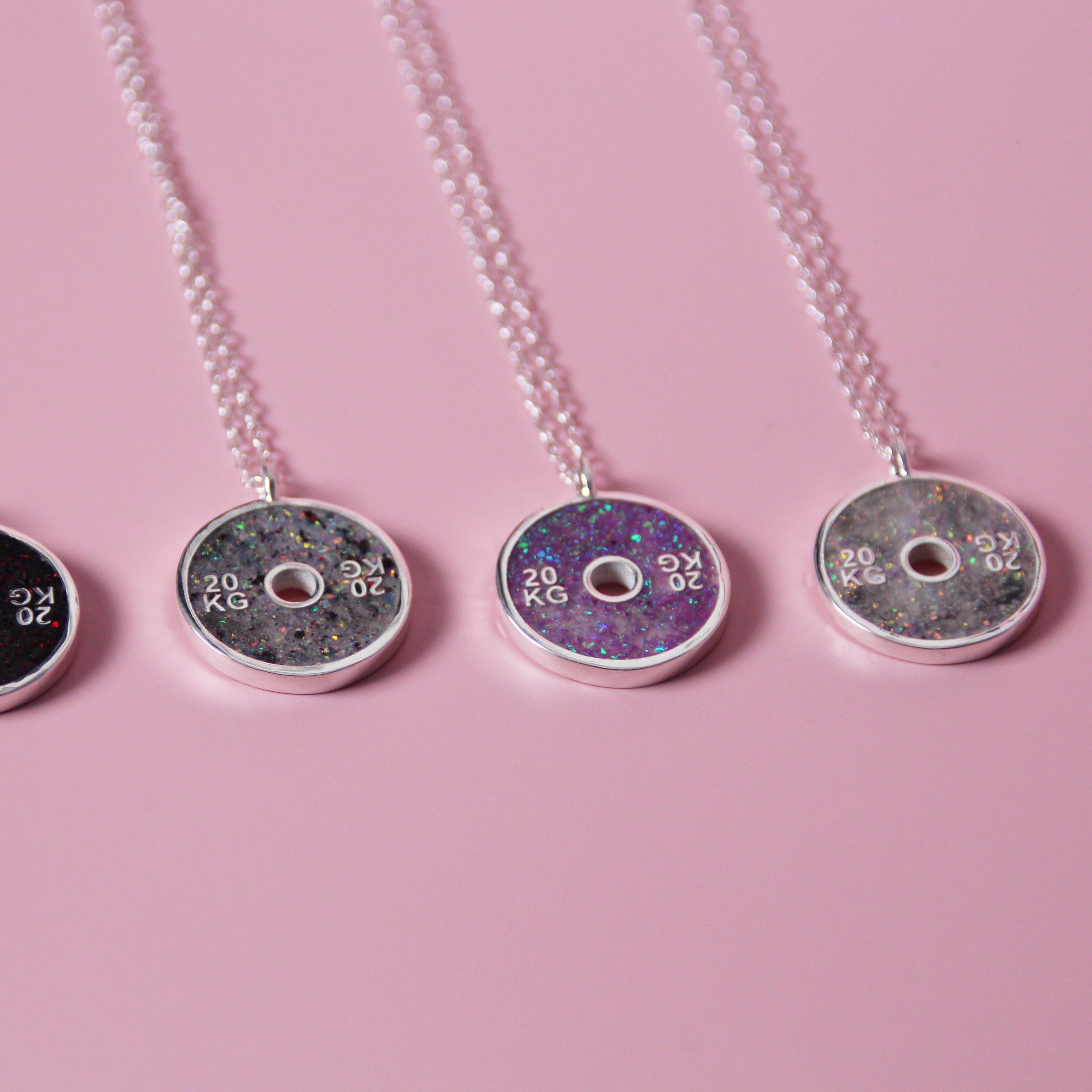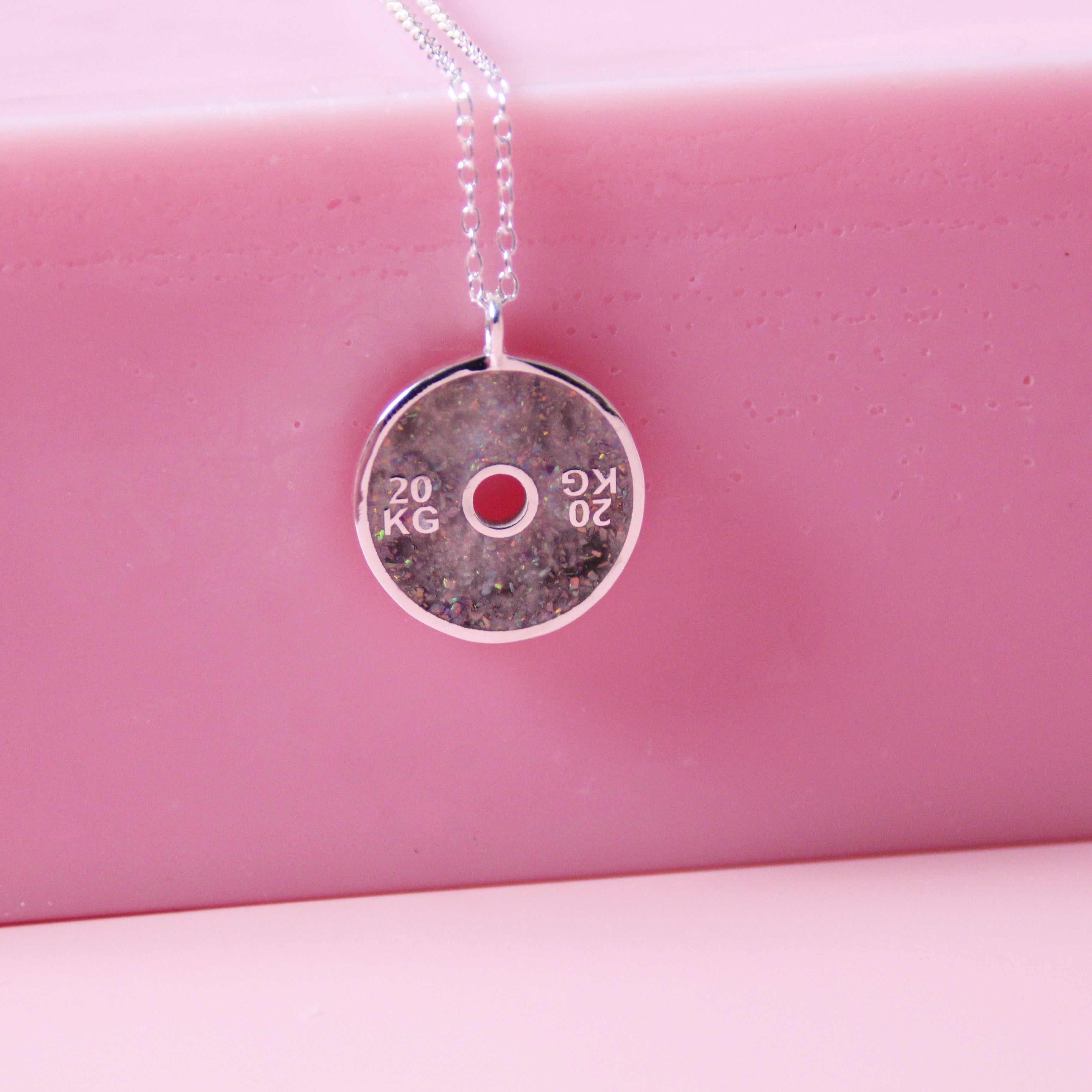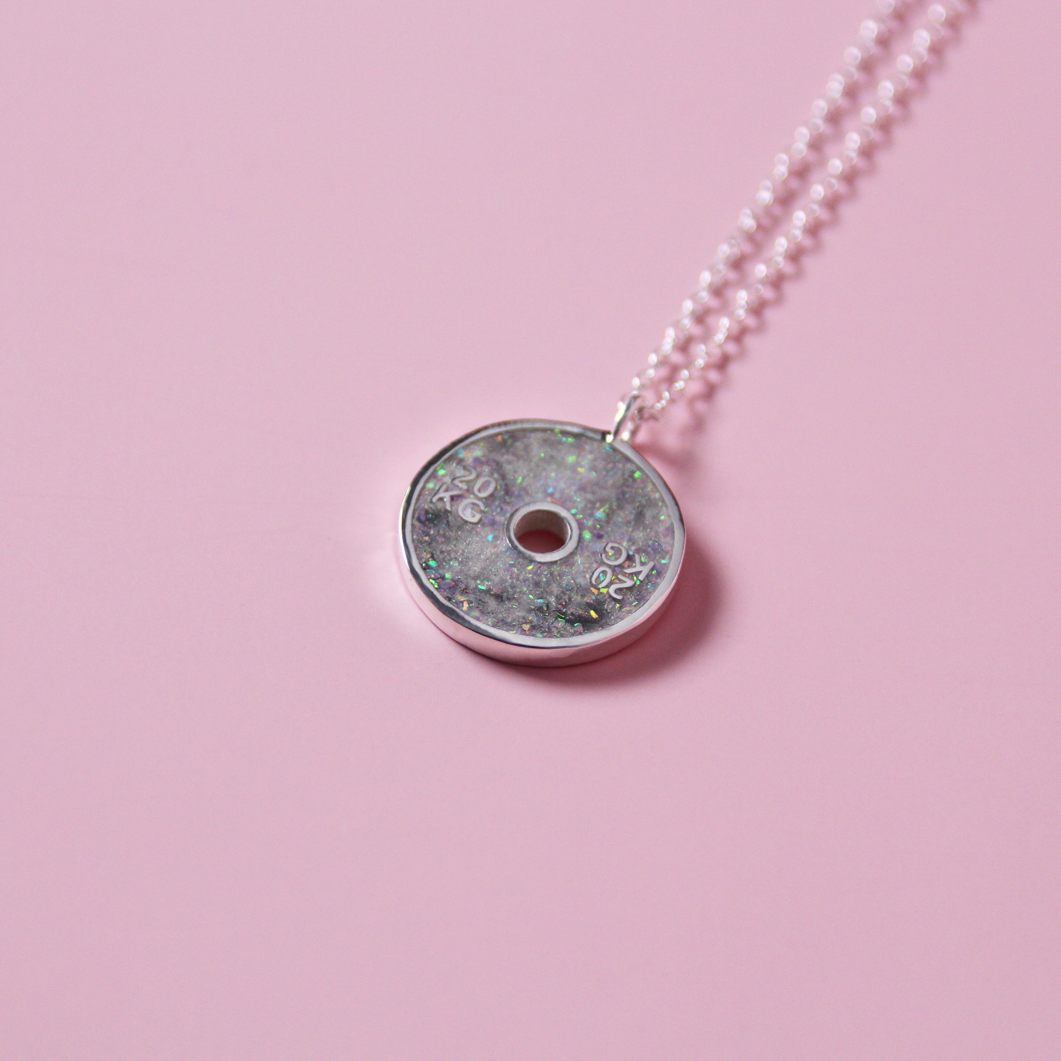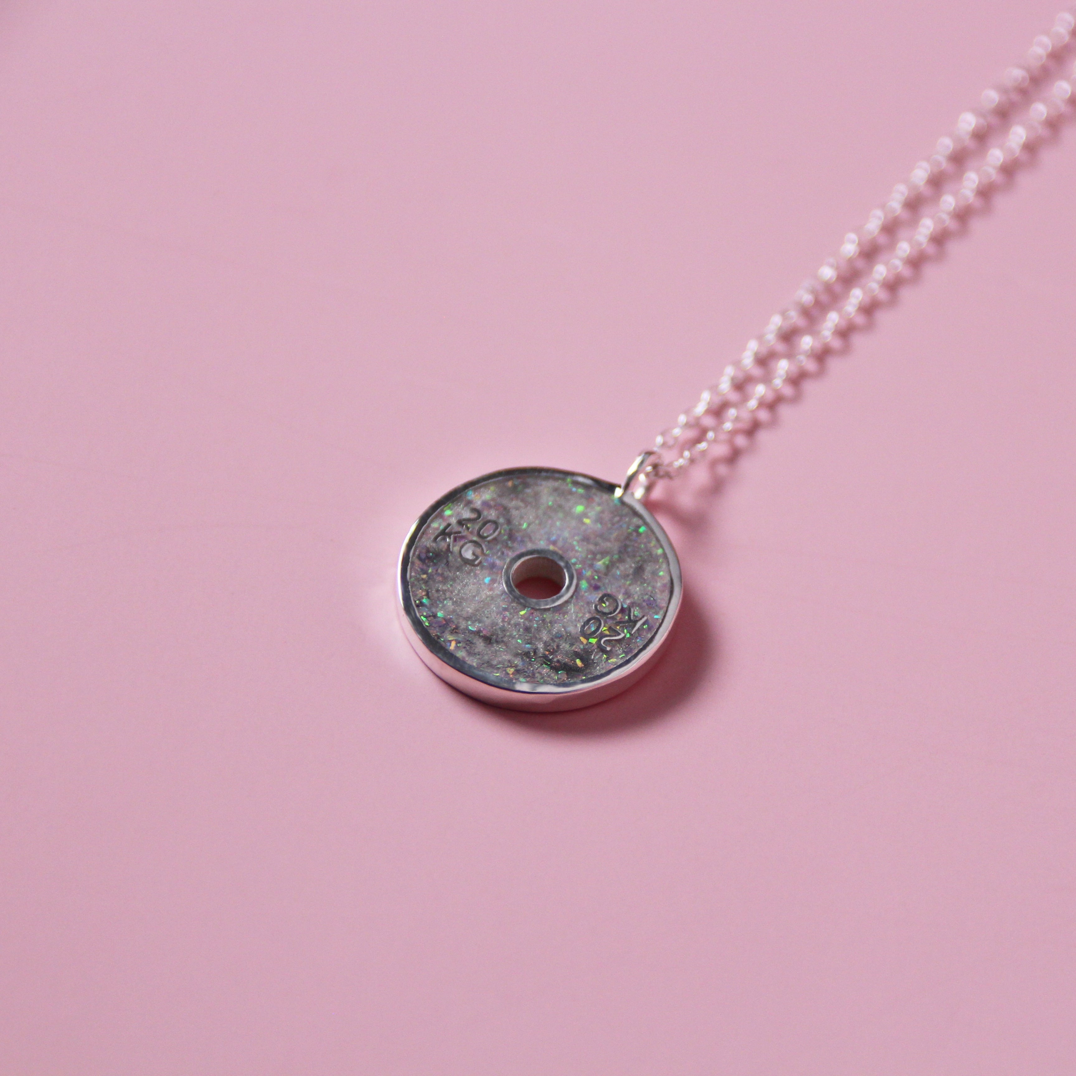 Show off your passion for fitness with our Gym Bumper Plate Necklace. This one-of-a-kind sterling silver piece is inlayed with lab opal and polished to a high shine.