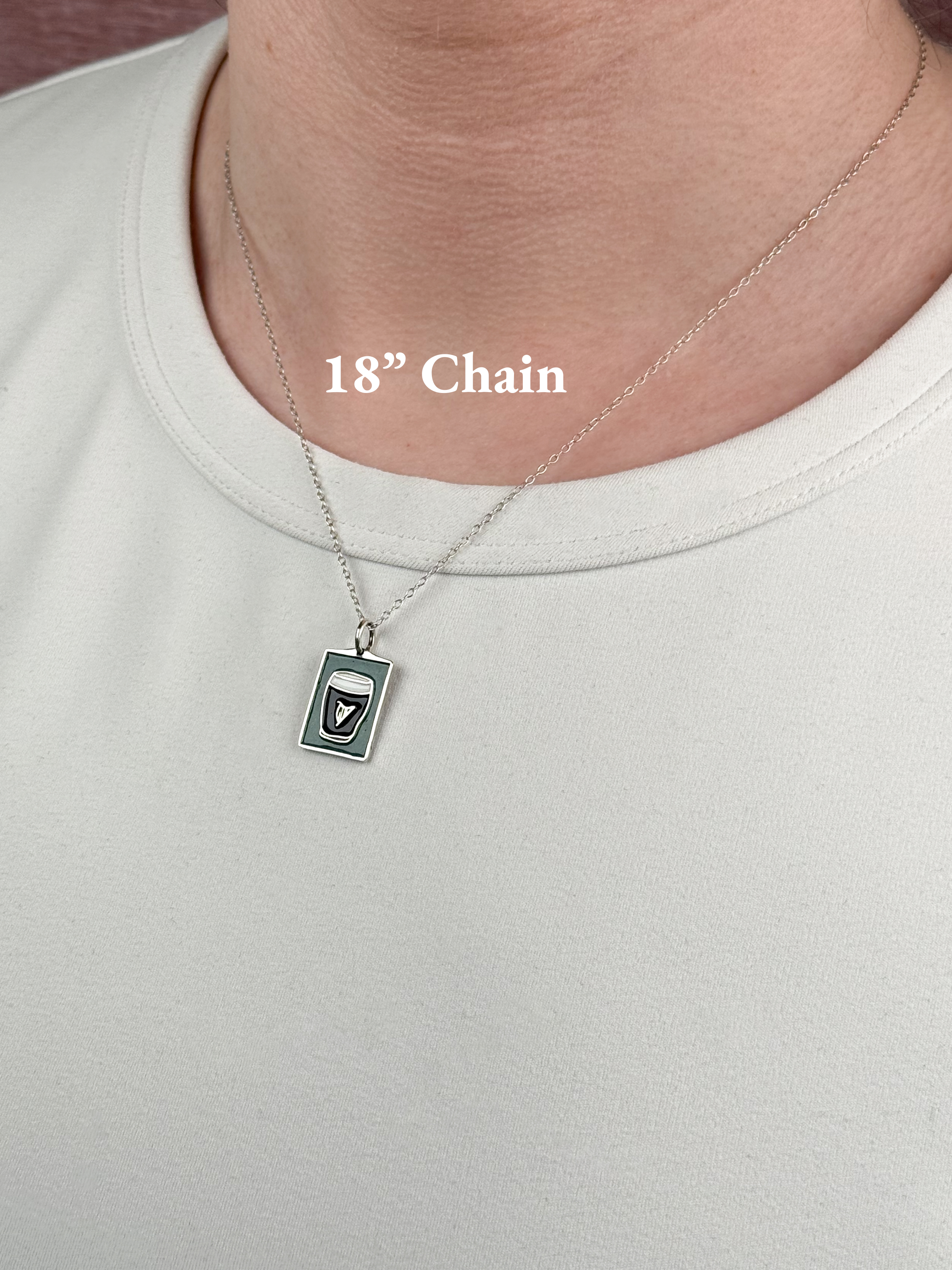 The Pint Necklace features a dark green background and is crafted in either solid sterling silver or 9ct gold and has an 18 or 24 inch chain.